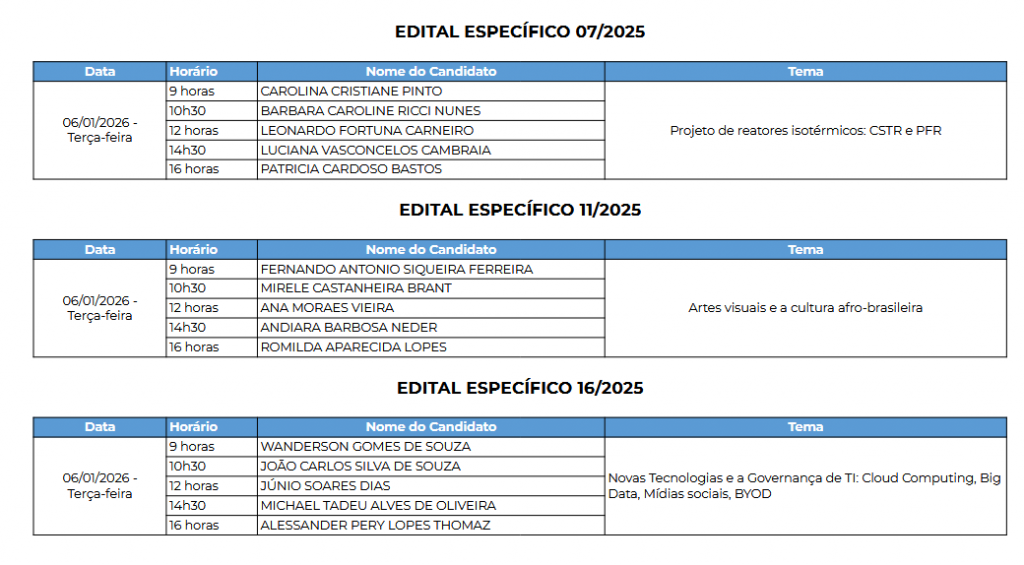 05/01/2026 – Divulgados os Temas sorteados para as Provas Didáticas de 06/01/2026 (1º dia) e as respectivas ordens de apresentação dos candidatos.